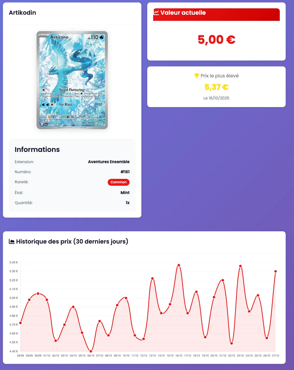 - Suivi de l’évolution des prix : consultez des graphiques et des statistiques pour observer la fluctuation de la valeur de vos cartes dans le temps.