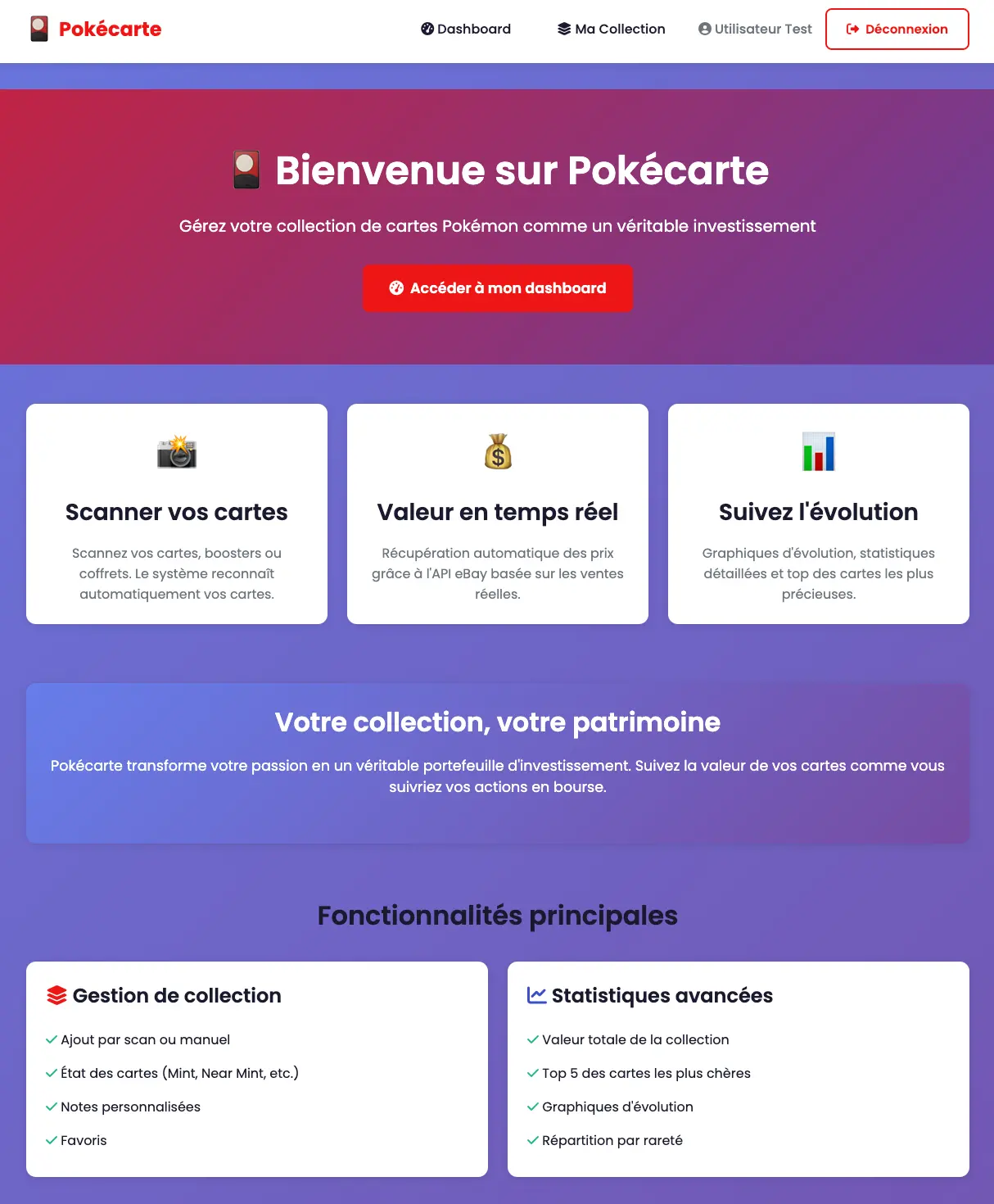 Conçue pour les collectionneurs, investisseurs et joueurs, l’application intègre un moteur d’analyse puissant et une interface moderne permettant de visualiser l’ensemble de votre collection en un clin d’œil. Que vous possédiez quelques cartes ou des milliers, Pokecarte centralise toutes les informations utiles pour que vous puissiez suivre vos cartes comme un véritable portefeuille d’investissement Pokémon.